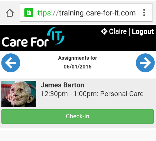 In the example below, we can see that the carer must be in the correct place, at the correct time and has successfully shared their location (this can be seen by the compass symbol to the left of the carer's name) as the check in button is present: